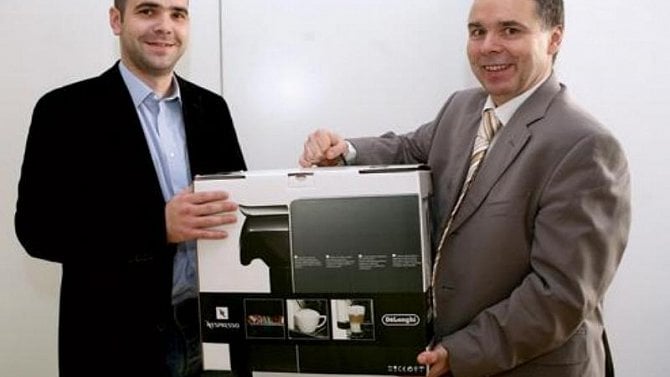 Martin Štich (vlevo) ze společnosti HFS, která provozuje taxi služby, si z redakce týdeníku Profit odnesl luxusní kávovar DeLonghi Nespresso lattissima.