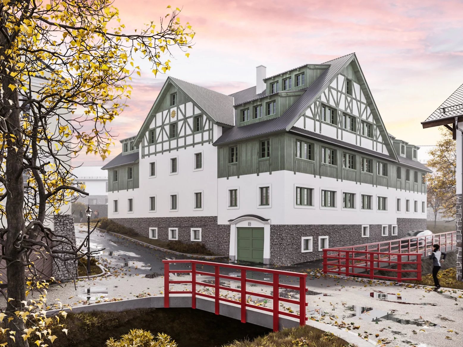 • Získávání stavebního povolení představovalo velmi náročný proces. Protože celé okolí je památkově chráněné, musí budovy respektovat historickou podobu místa